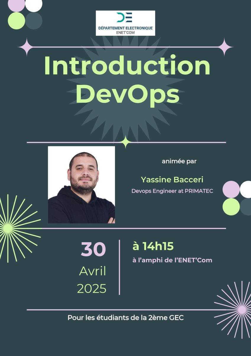 A seminar for 2nd year GEC students entitled “Introduction DevOps” is scheduled for Wednesday April 30, 2025 starting at 2pm in the ENET'Com amphitheater: